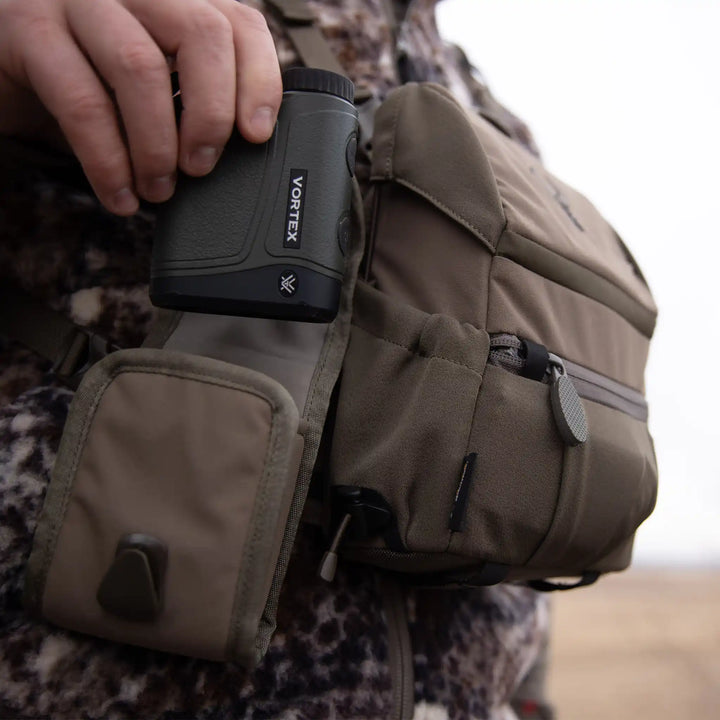Hand holding a Vortex rangefinder near a Badlands chest pack with visible skull logo, outdoors.