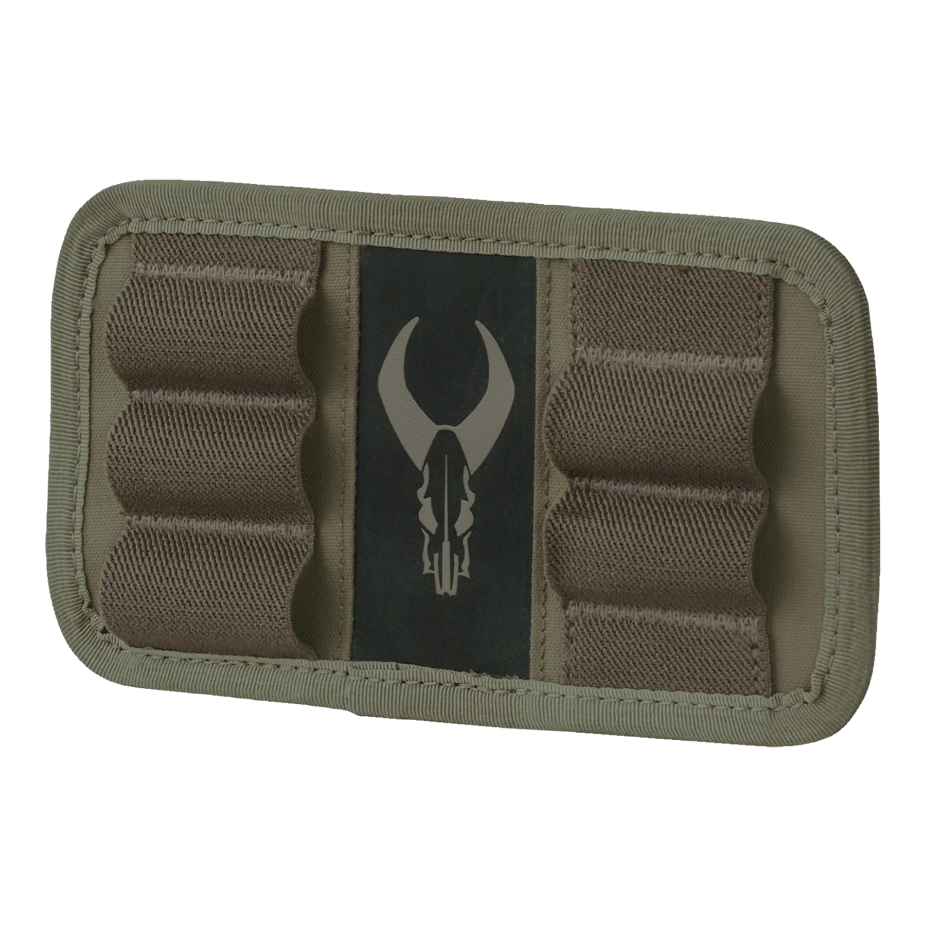 Tan Badlands ammo holder with elastic loops and a black panel featuring the Badlands skull logo in the center.