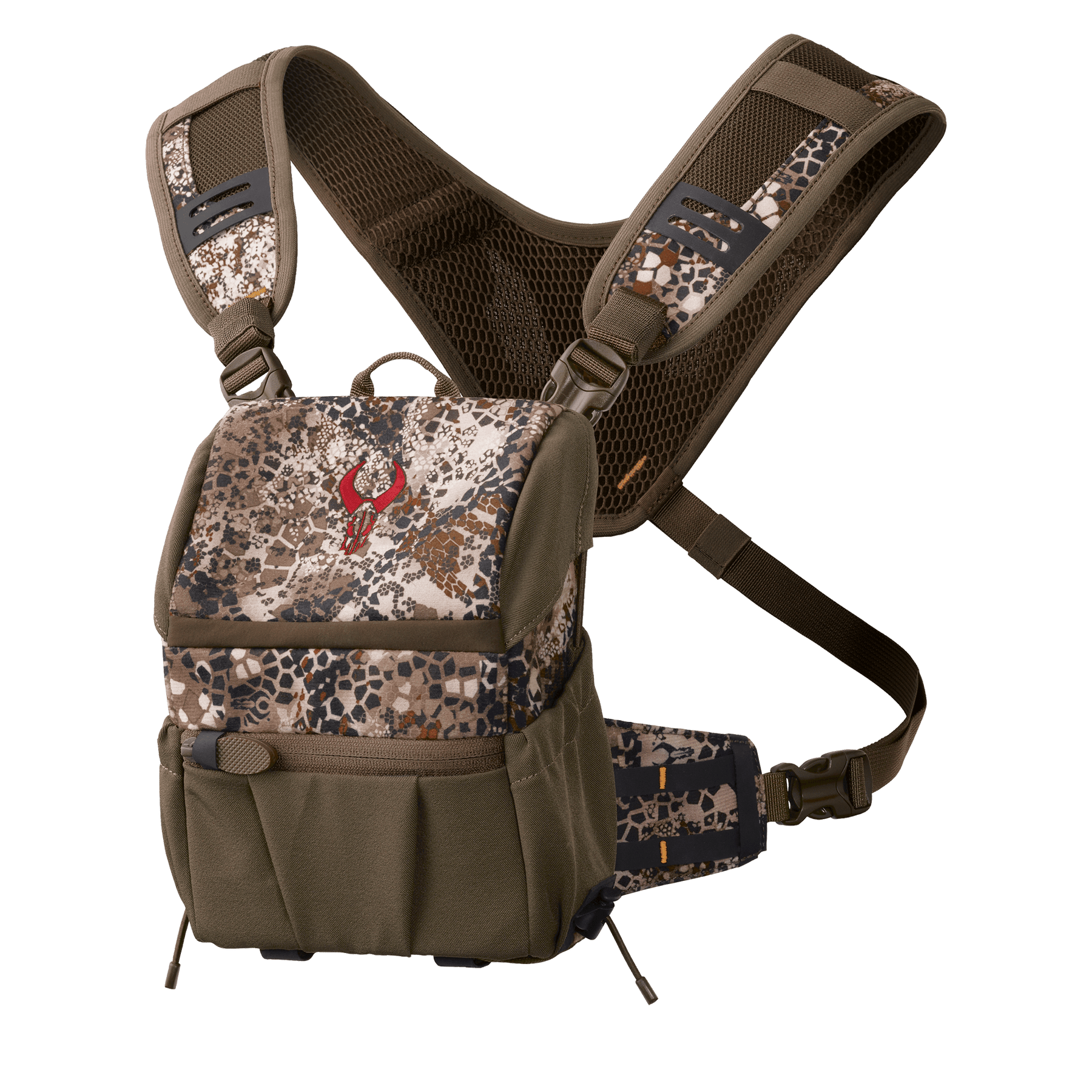 Badlands camo bino harness with open pouch, holding binoculars; Badlands skull logo visible on front.