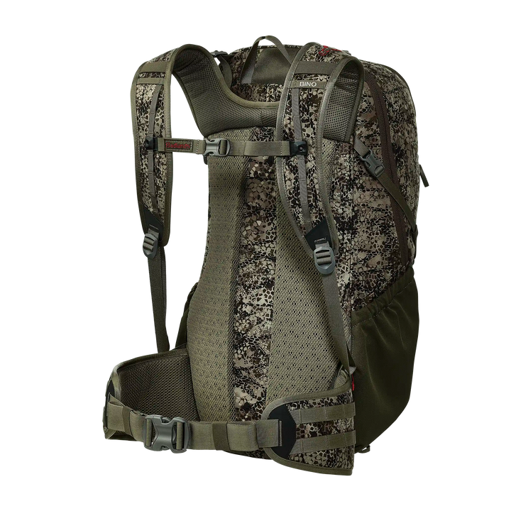 Close-up of a Badlands camo backpack with zipper, strap, and buckle; textured fabric for durability and comfort.