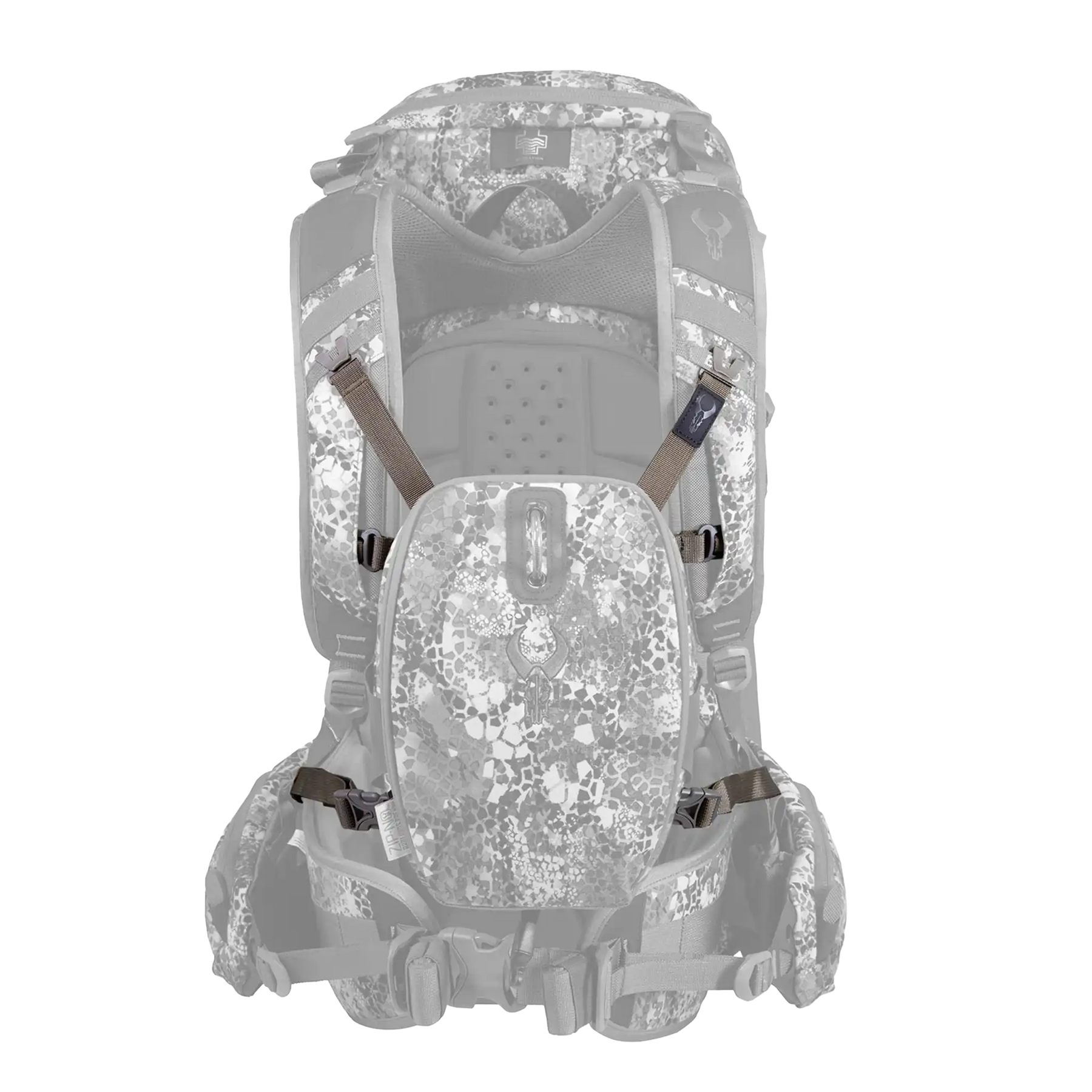 Close-up of a Badlands backpack strap with the Badlands skull logo on a black patch, featuring adjustable webbing.