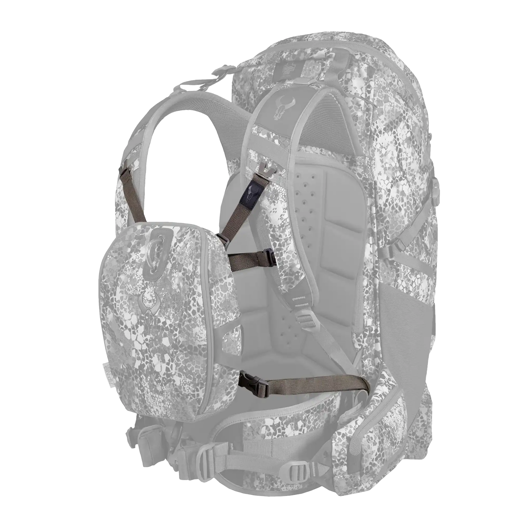 Badlands camo backpack with detachable pouch; skull logo visible on pouch. Straps connect pouch to main pack.