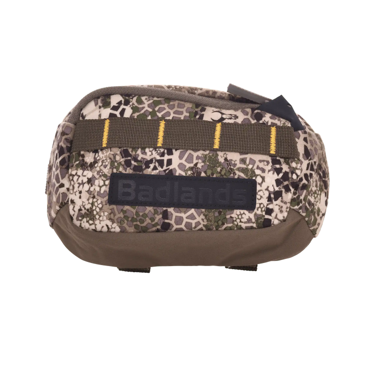 Badlands camo waist pack with logo, attached to a backpack hip belt for easy access during outdoor activities.