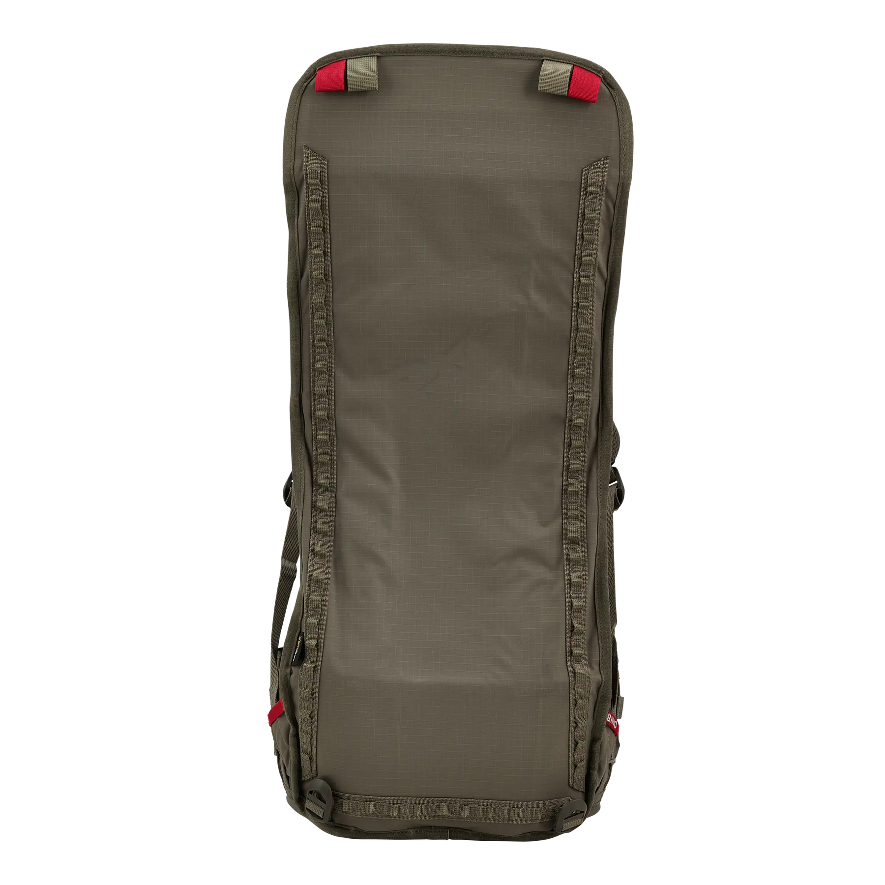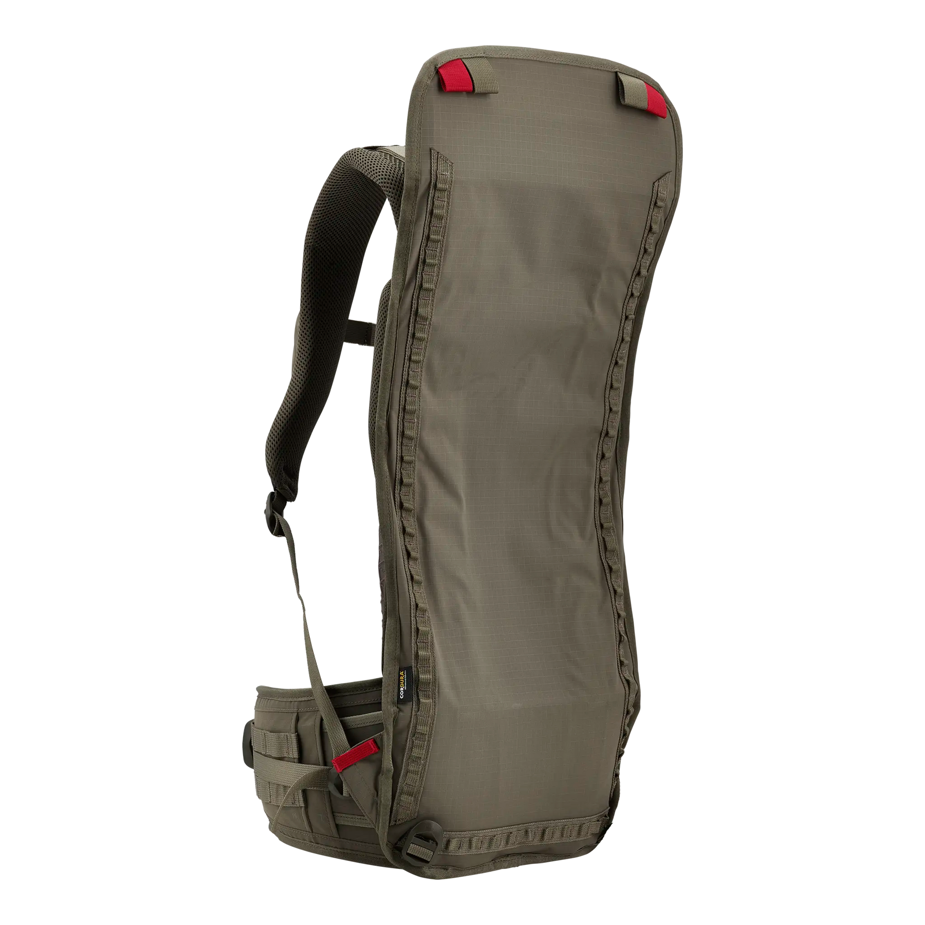 Olive Badlands hunting pack frame with padded shoulder straps, red accents, and Badlands logo on the hip belt.