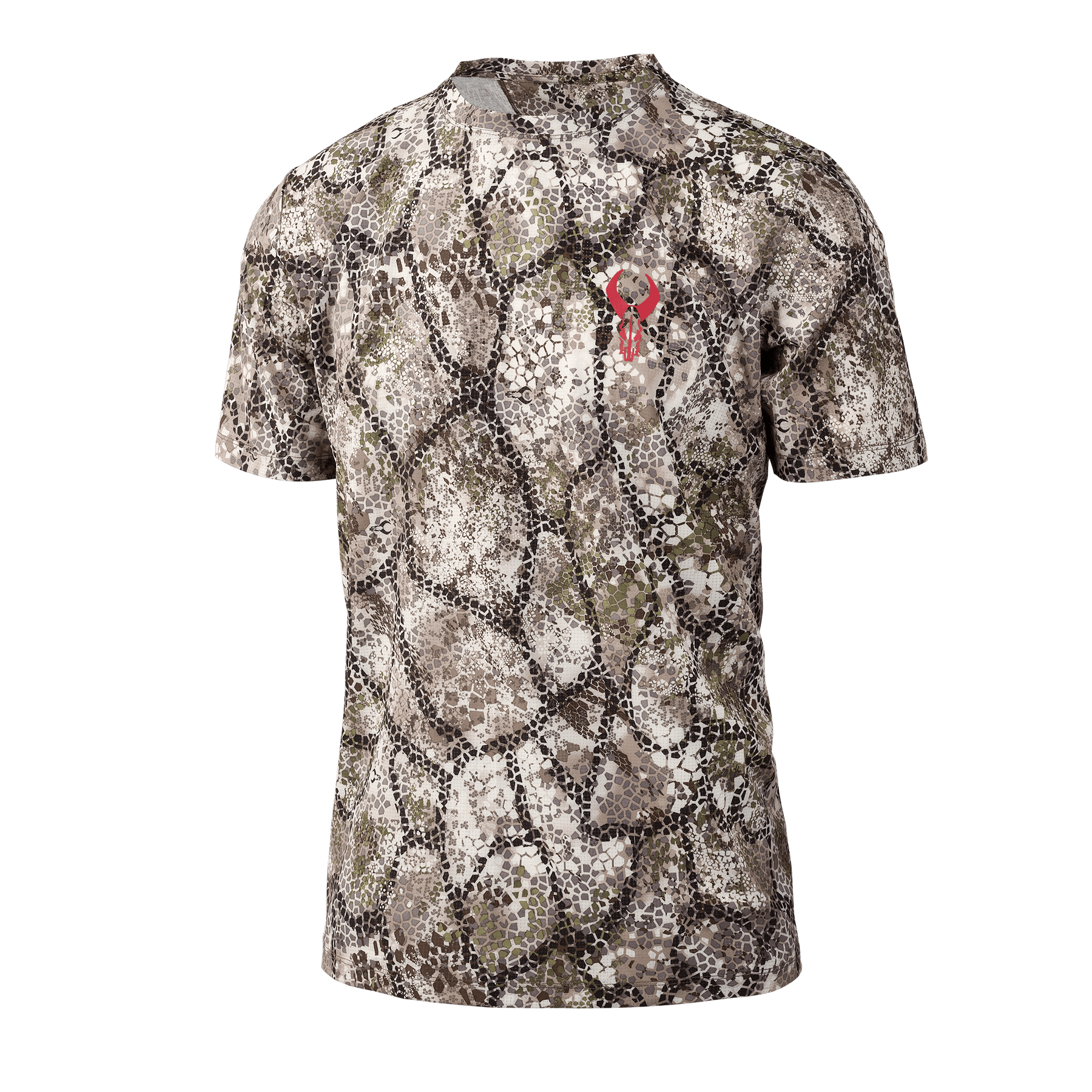 Short-sleeve camo shirt with Badlands red skull logo on chest; earth-tone pattern for outdoor use.