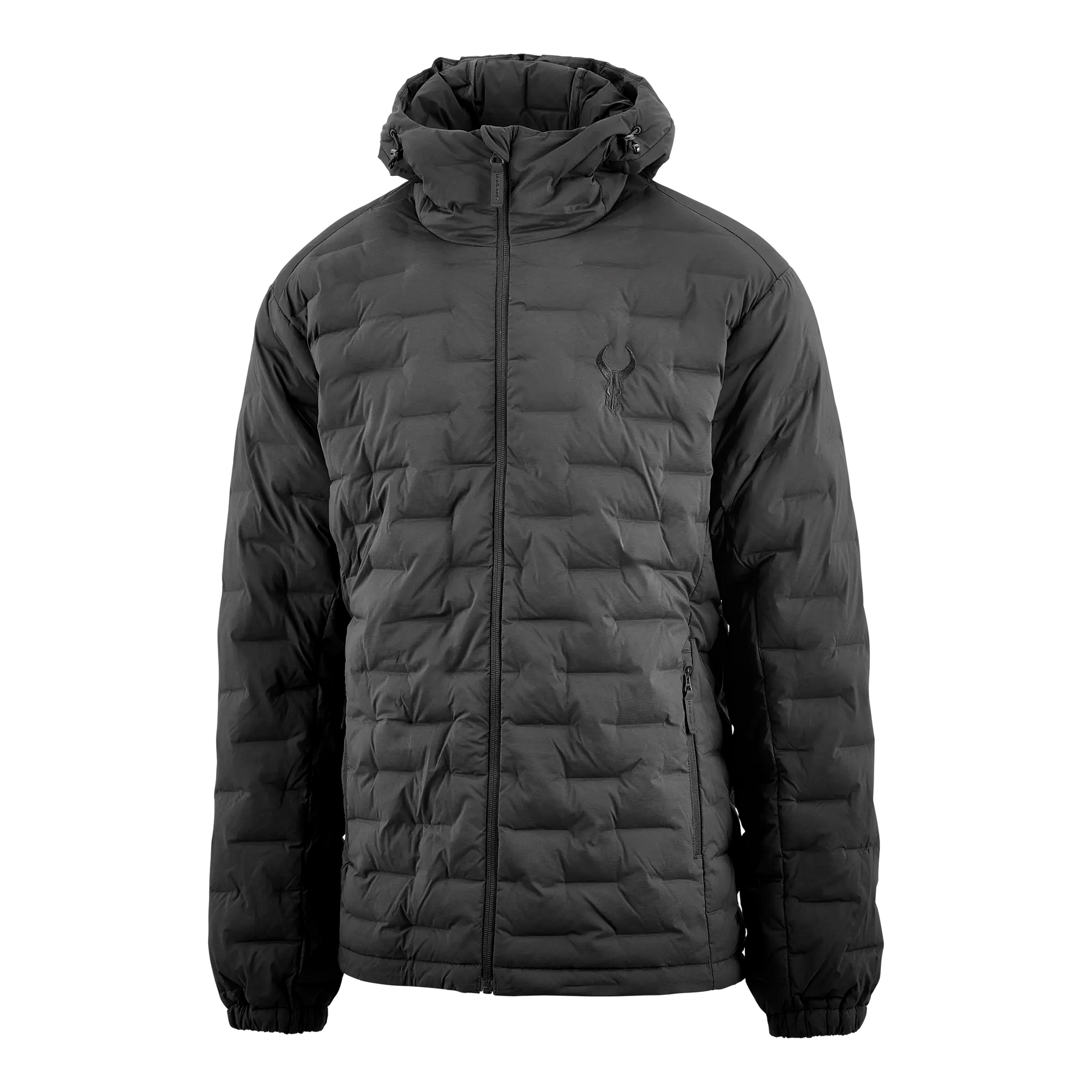 Black Badlands puffer jacket with hood and front zipper; features subtle Badlands skull logo on chest.