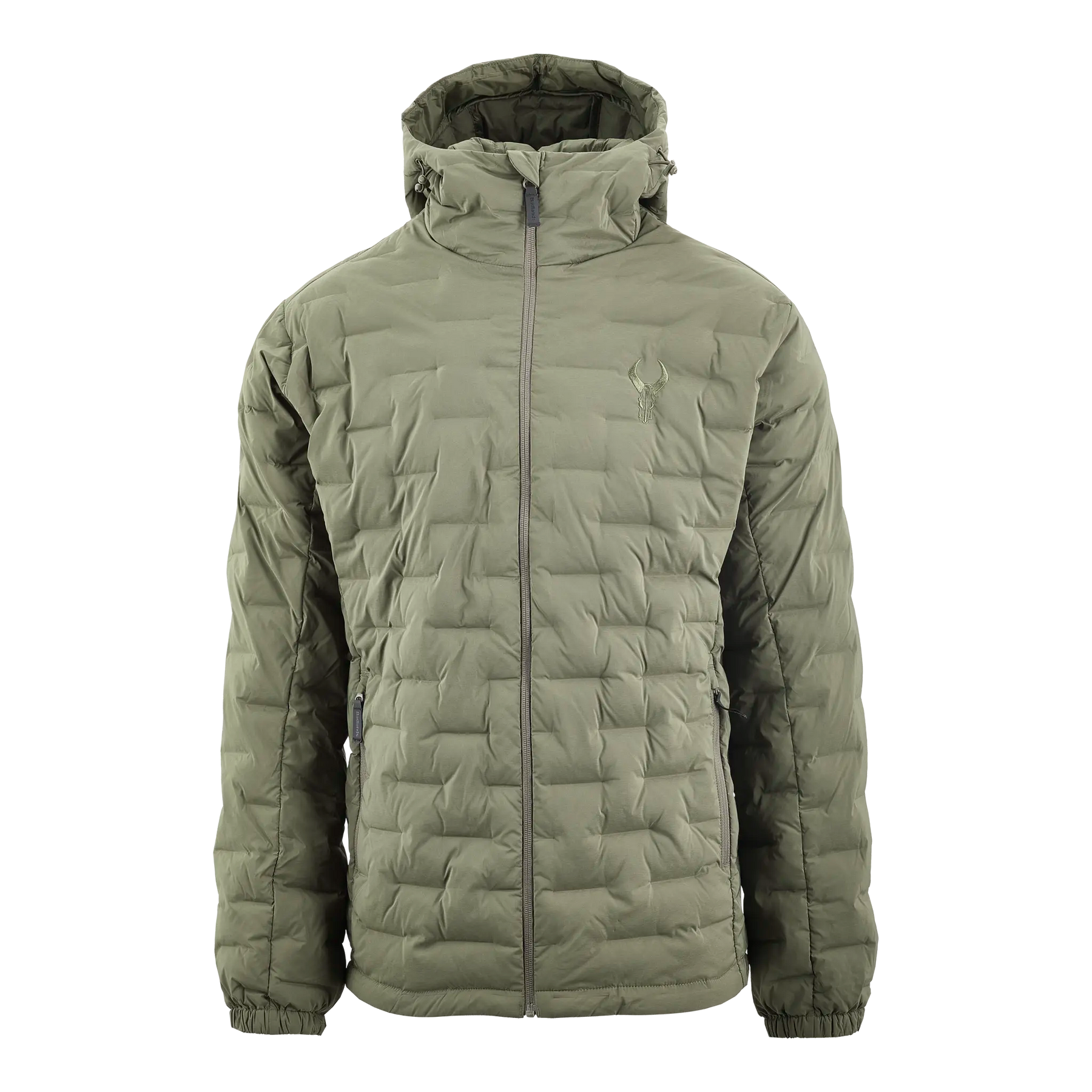 Olive Badlands insulated jacket with hood and front zipper, featuring the Badlands skull logo on the chest.