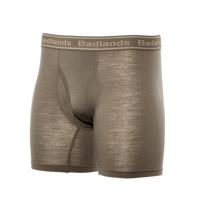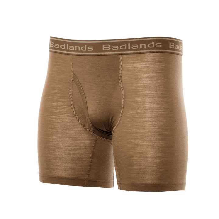 Tan Badlands boxer briefs with logo waistband, designed for comfort and support during outdoor activities.